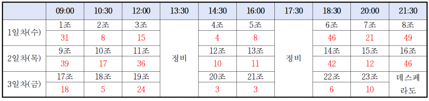 11월 6일(목) | 9조 ~ 16조 | 08:20 ~ 20:00 |